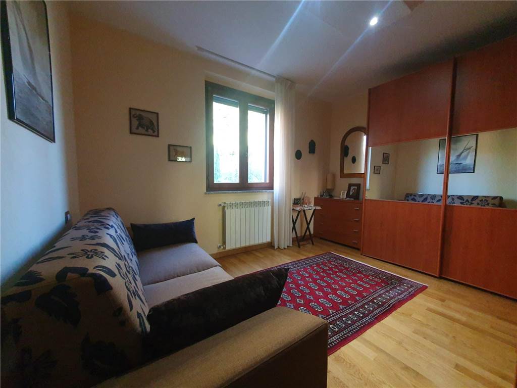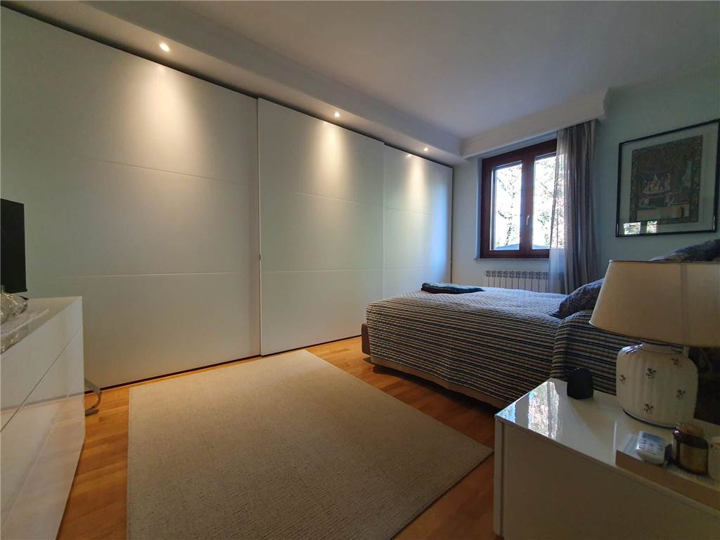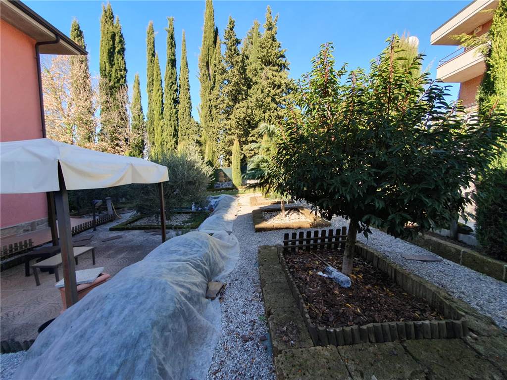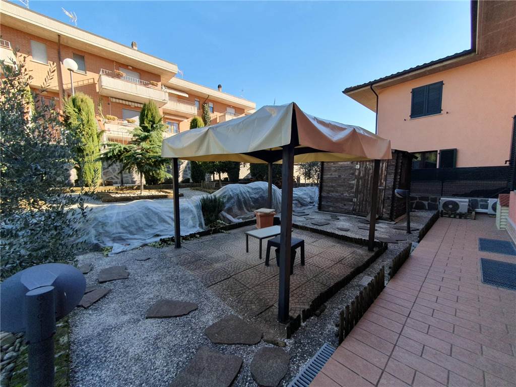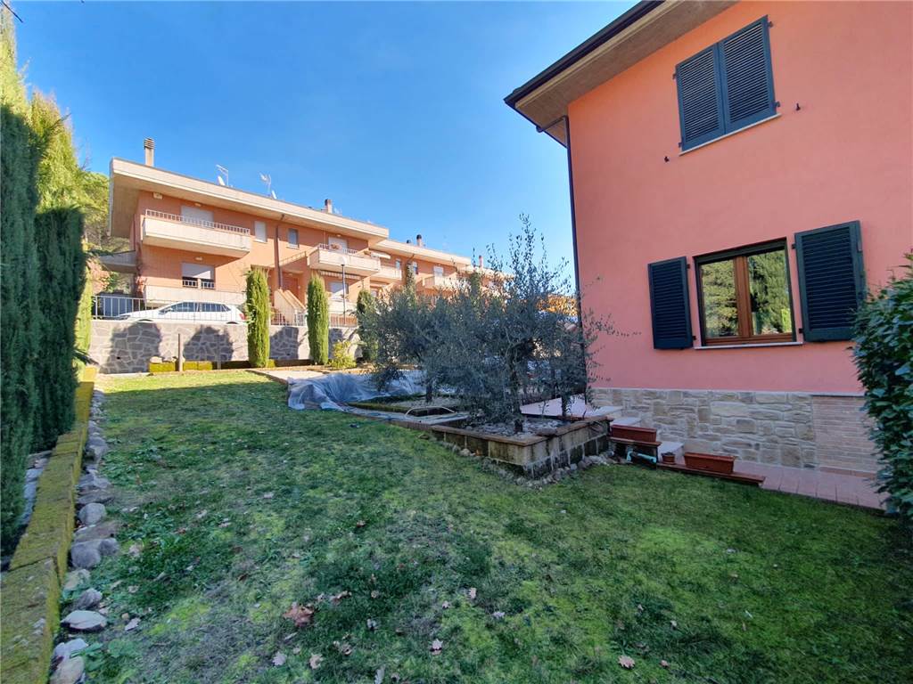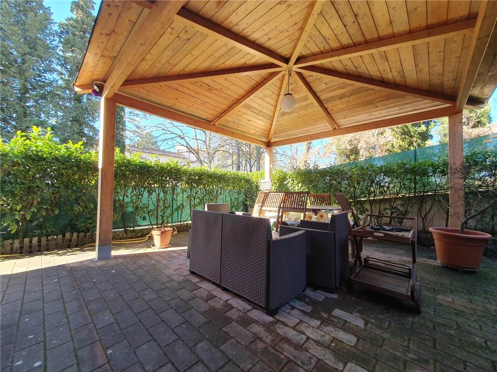 L' unità abitativa è composta da: cucina, ampio soggiorno con accesso al terrazzo, due camere matrimoniali, studio e due bagni. Ad impreziosire la proprietà, splendido giardino terrazzato, finemente curato, gazebo in legno e locali pertinenziali al piano terra adibiti ad autorimessa e magazzino con lavanderia.
